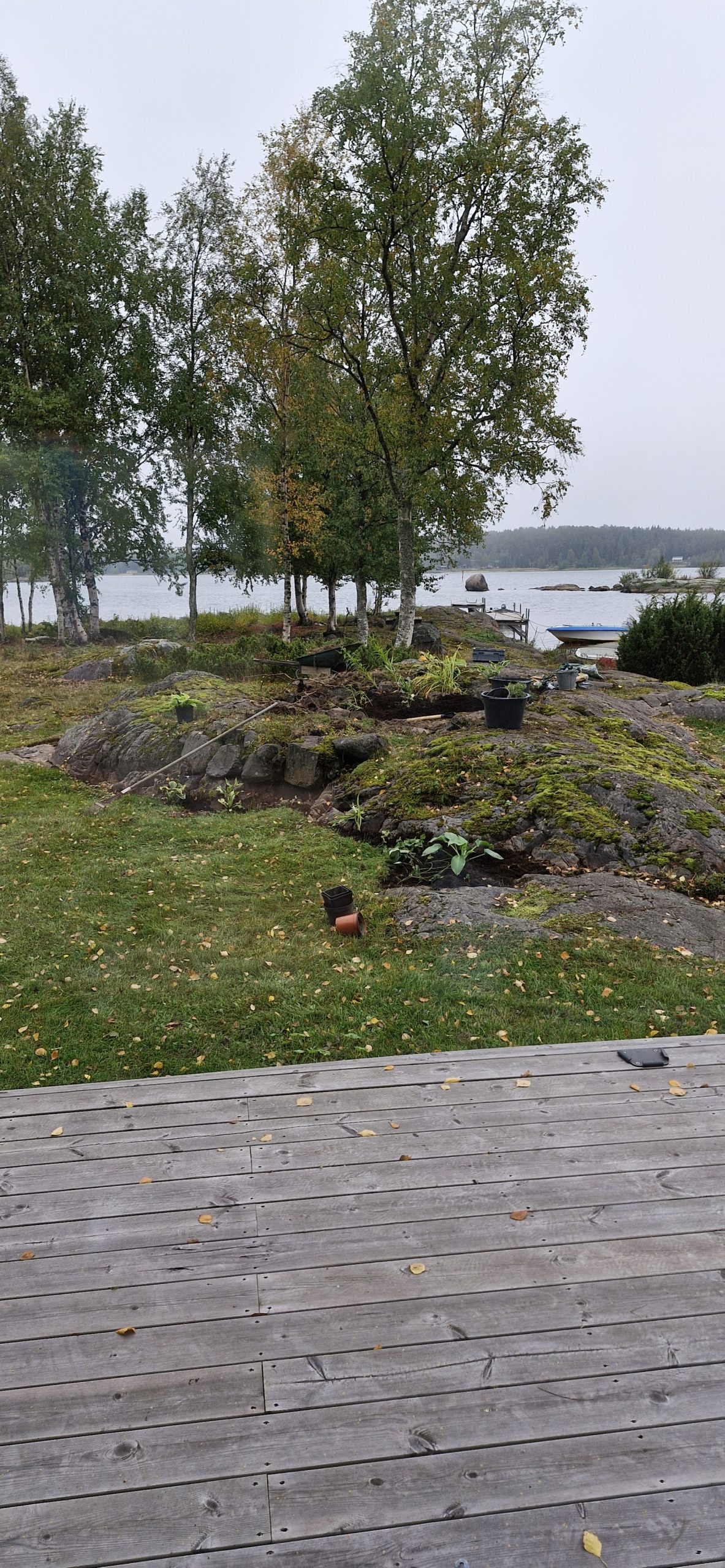 Under hösten fraktades jord på påse i båten för att börja anlägga rabatter bland stenarna.